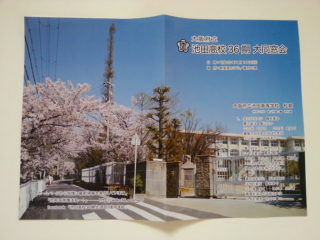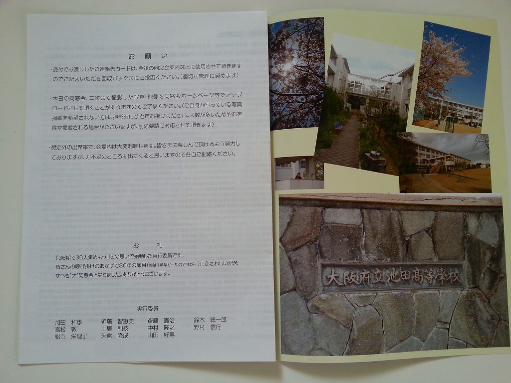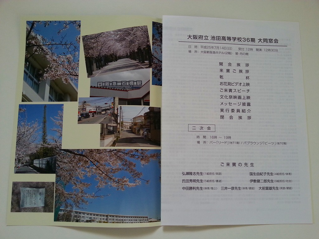はじめは”大”同窓会と、ほぼシャレのつもりで付けましたが、やっぱり夢は大きく心は熱く!願いはかなうもんですね(^^)v。そんな大同窓会に、箔をつけてくれたのがこの「しおり」。写真も実行委員何名かが桜の時期に撮影に出向いてくれたものです。